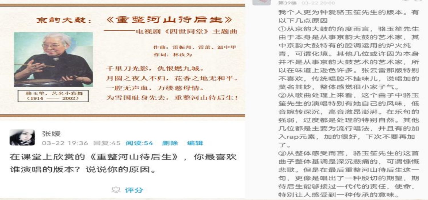 (文/张媛、李琳琳)2022年春季学期,我们经历了自疫情蔓延以来持续周期最长的一次线上教学。面对长期由教室到网络教学环境的转变,根据黑龙江省教育厅和我校疫情防控相关精神,我积极钻研在线教学技术与方法,更新理论课程的传统教法,结合音乐学(师范)专业的学科性质,从教学内容、教学模式、课程思政等方面进行改革创新,构建了体现“专业知识-实践能力-职业素养”教育的《中国民族民间音乐》课程云端智慧课堂(超星学习通+腾讯会议+微信)。在课程实施过程中,我与学生们同“屏”共振,深度互动,虽身处异地,却被我们共同拥有的国乐乡音紧密相连,用音乐讲述历史,用音乐传递温暖,用音乐传承文化。
