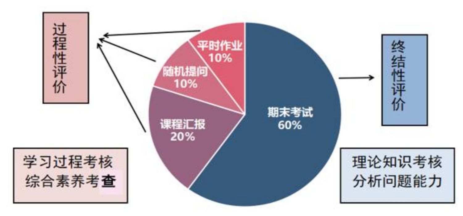 关注人才培养的综合素养及实践能力,本课程考核评价方法采用过程性评价(平时作业、随机提问、课程汇报)和终结性评价(期末考试),将小组课程汇报融入过程性评价,期末考试试卷加大主观题、能力题的分值比重,激发学生的家国情怀、爱岗敬业精神和文化认同、文化自信。具体考核内容比例如下图: