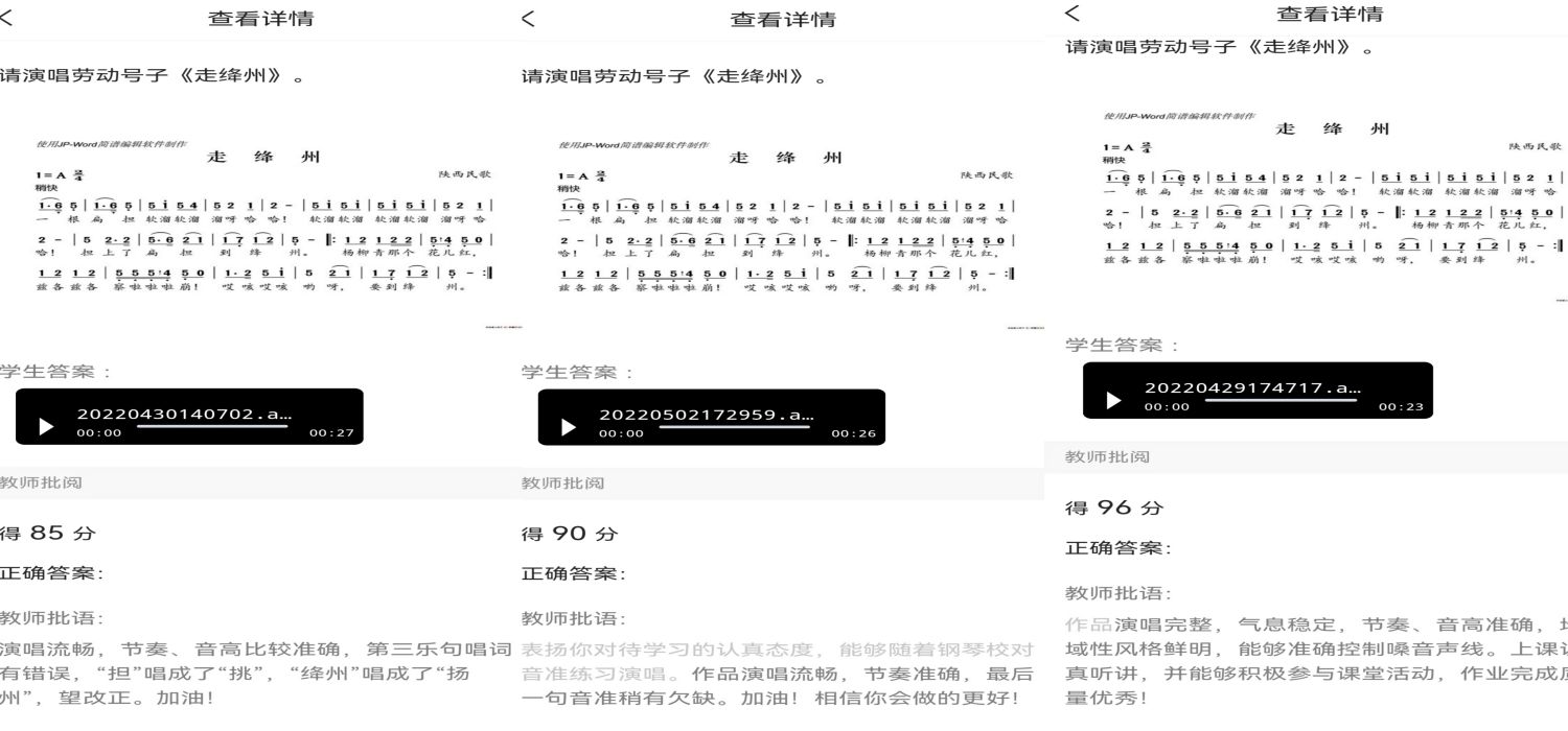学生在学习通以上传音频的形式完成模唱作业,教师评分与批语