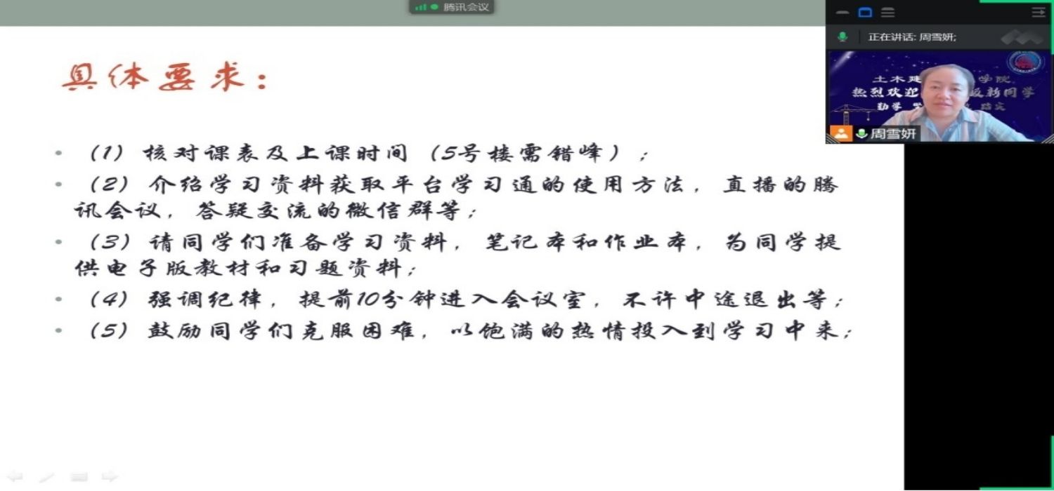 精细落实,线上教学平稳有序。老师们全部采取线上直播的教学方式进行授课和互动,全程出镜、精神饱满,课上通过巧妙设置问答,引入案例等环节,激发了学生的学习动机和学习热情,帮助学生们避免了焦虑紧张的心理;通过向学生简介课程内容、课程目标、教学方式方法,重点难点、学习要求、考核方式等,让学生们对大学课程有了更清晰的理解和认识;通过向学生介绍课程的学习方法,指导学生制定课程学习计划,帮助学生树立了尽快适应大学学习生活的信心。“线上教学第一课”教学过程中任课教师思路清晰、环节紧凑,学生课堂参与度高,课堂气氛活跃。
