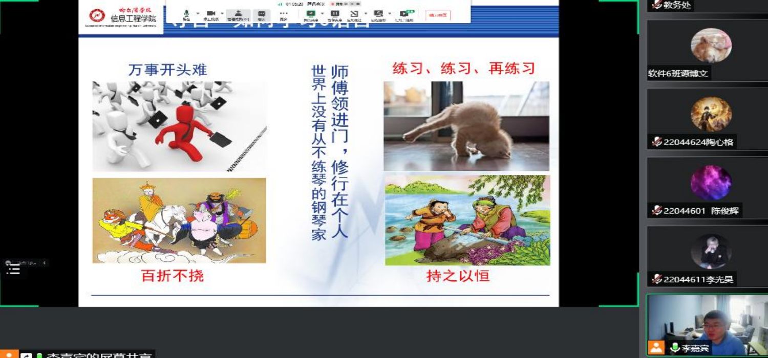 线上教学第一课对每一位教师的教学效果都是挑战,为了给新生提供高质量的大学线上课程,学校在2022年秋季学期教学工作会议对新生第一课做了专项要求的基础上,又以“教师寄语”的形式对任课教师授课环节设计、教学内容设计及课后总结等提出了具体的建议和要求。各二级学院认真落实,要求任课教师精磨细琢,认真打造第一课,要求教学内容要对新生有吸引力,融入专业导论和有关疫情的思政内容,让学生对后续课程和对专业知识的学习充满渴望。采取建好课程微信群,提前与学生交流,进行开课前的线上授课测试等方式,并要求各专业及早将新生学业导师安排好,在开课前与新生云端会面,帮助指导新生上好第一课。