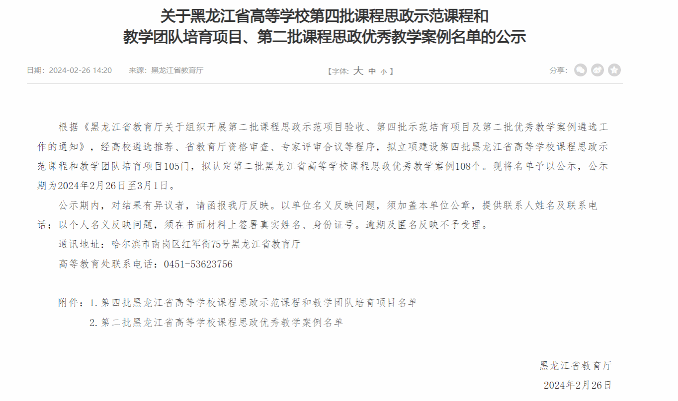 (文/迟生茂)近日,省教育厅公布了黑龙江省高等学校第四批课程思政示范课程和教学团队培育项目、第二批课程思政优秀教学案例名单,我校推荐的4门课程全部获批课程思政示范课程和教学团队、2项案例获批课程思政优秀教学案例。