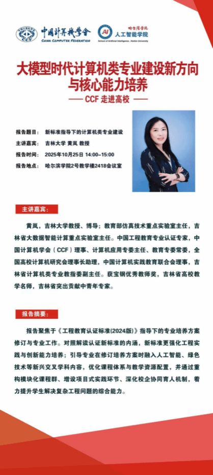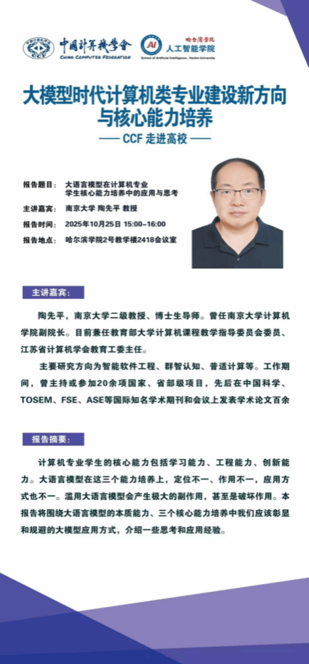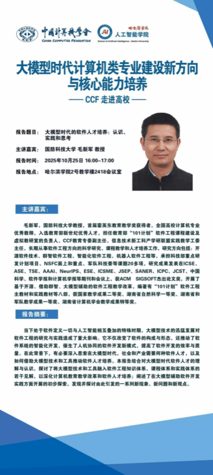 大语言模型技术的迅猛发展,使计算机类专业教育面临前所未有的挑战。为精准对接行业核心人才需求,“CCF教育专委会走进哈尔滨学院—大模型时代计算机类专业建设新方向与核心能力培养”学术报告会即将启幕,拟定于2025年10月25日(周六)下午13:30~17:40在哈尔滨学院2号教学楼2418会议室举行。