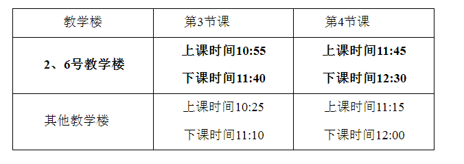 5.错时上下课。因学校部分食堂改造,为了错开中午就餐高峰,自本学期第1周开始,对2、6号教学楼的上午3、4节课程的上下课时间进行调整(上下课时间延后30分钟):