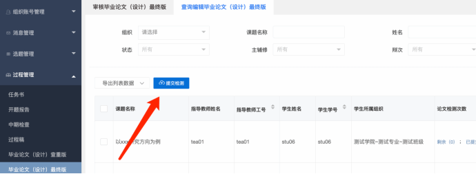 4.毕业论文(设计)最终版指导教师提交检测具体方式:点击系统左侧-过程管理-查询毕业论文(设计)最终版-点击“提交检测”按钮进行查重。