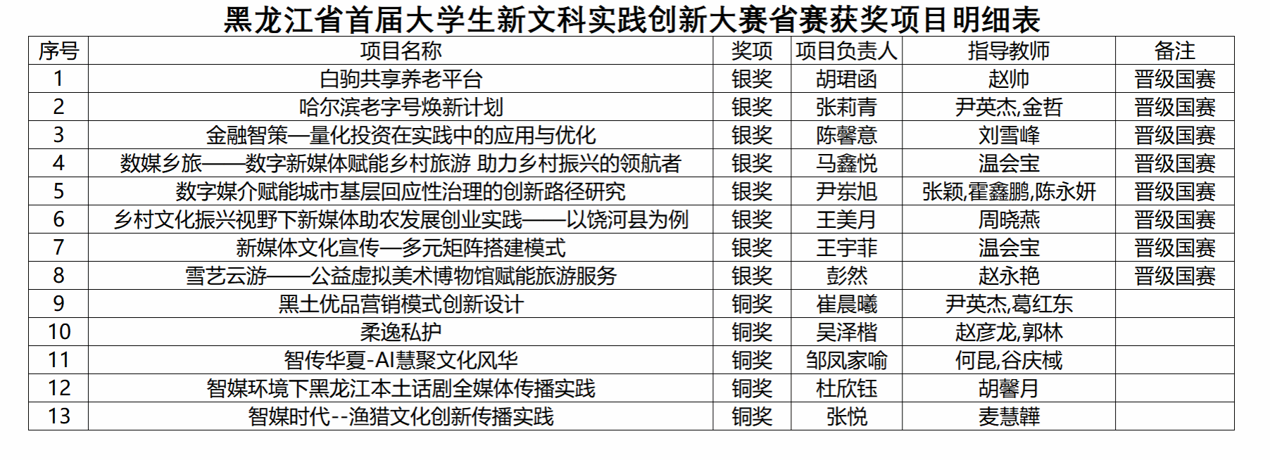 (文/陈涵)近日,由黑龙江省教育厅主办,黑龙江大学承办的首届新文科实践创新大赛落下帷幕。我校学子在本次比赛中取得优异成绩,荣获8银5铜,并有8个项目晋级全国总决赛。