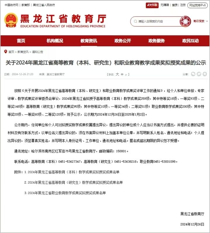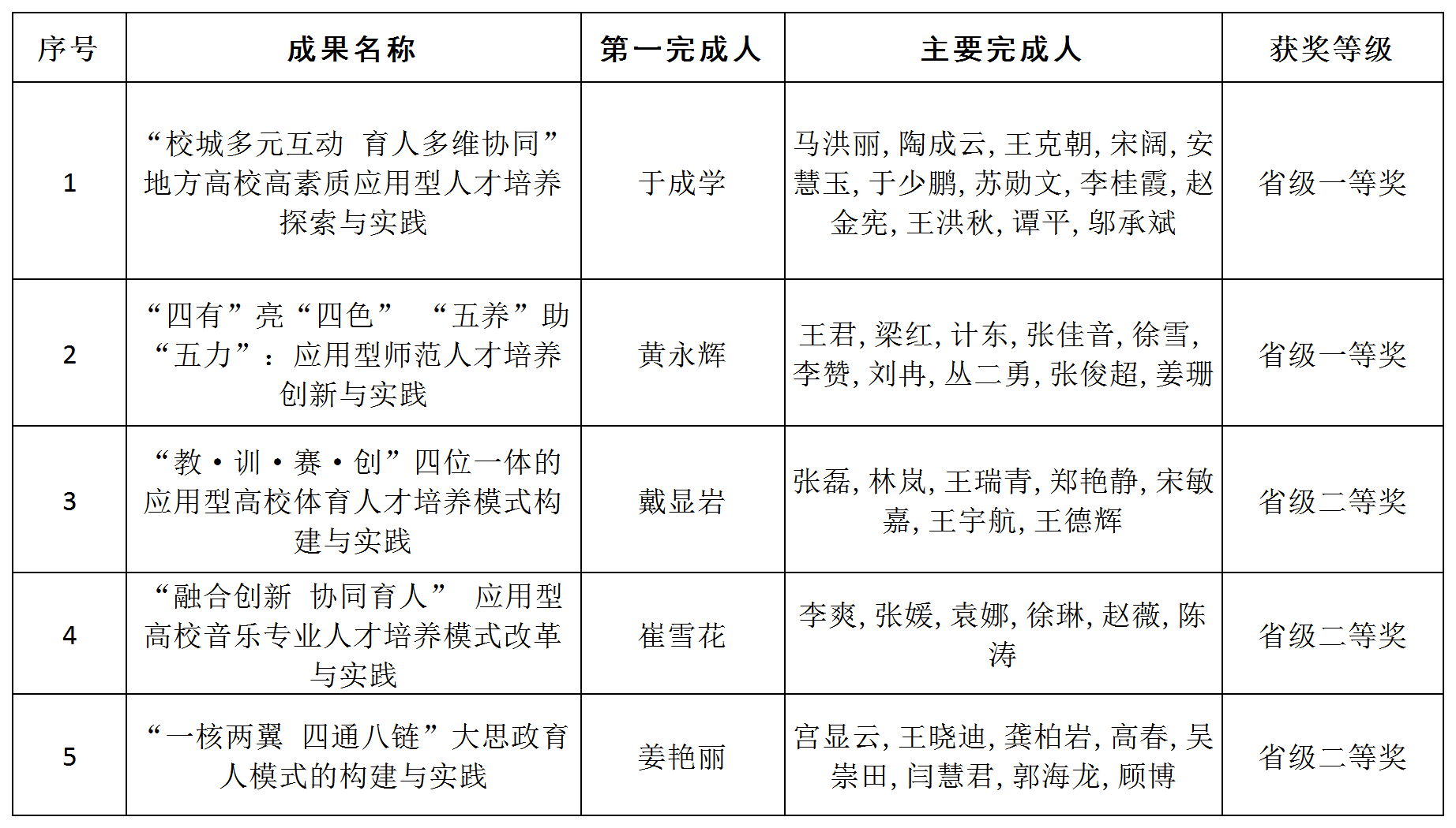 (文/马彦龙)近日,黑龙江省教育厅对2024年高等教育教学教育教学成果奖拟授奖成果进行了公示,我校喜获5项奖项,其中一等奖2项、二等奖3项,一等奖获奖数量实现历史新高。获奖成果聚焦高素质应用型人才培养,涵盖了多个学科领域,其中音乐、体育学科在教学成果奖中取得新突破。