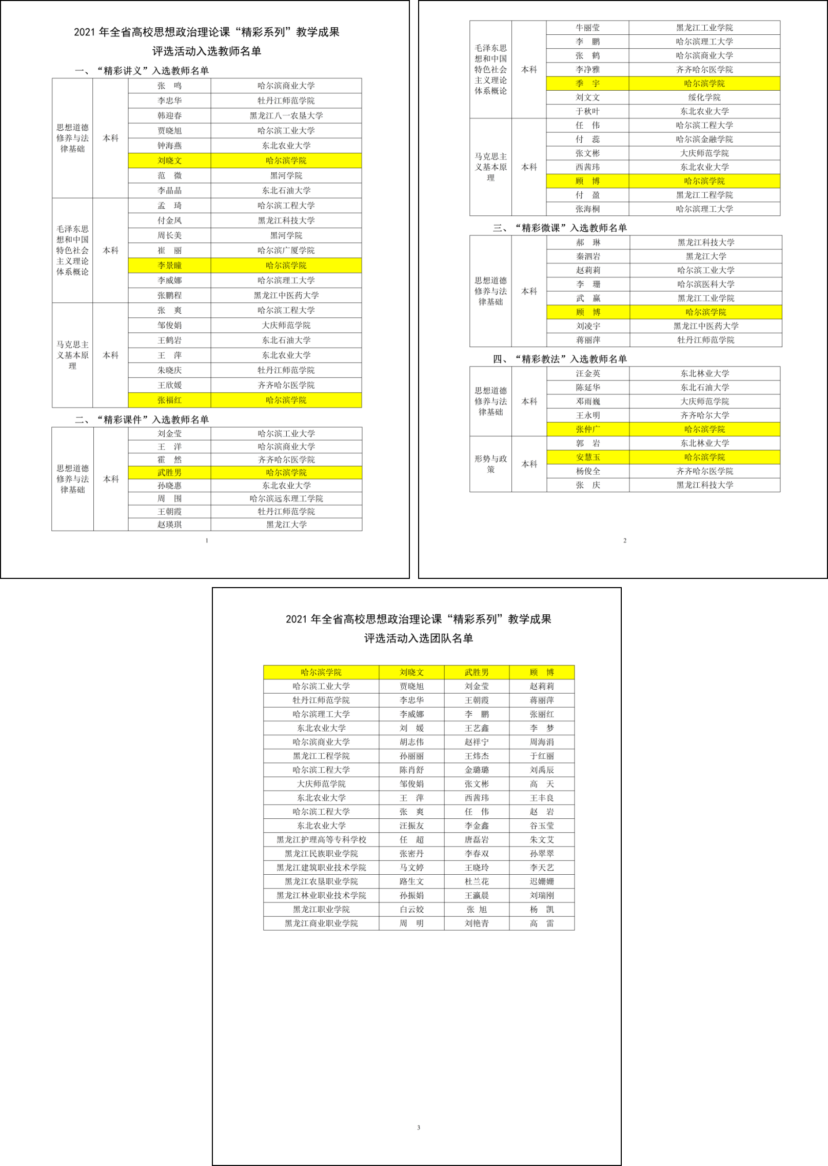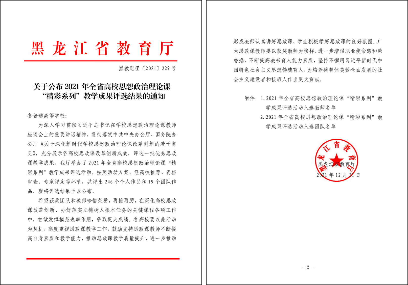日前,黑龙江省教育厅举办的2021年全省高校思想政治理论课“精彩系列”教学成果评选结果正式公布。我校共有9项个人作品和1项团队作品入选,取得了历史空前的好成绩,获奖总数居于全省高校前列,充分展示了我校思政教师的水平与风采,为学校争得了荣誉。