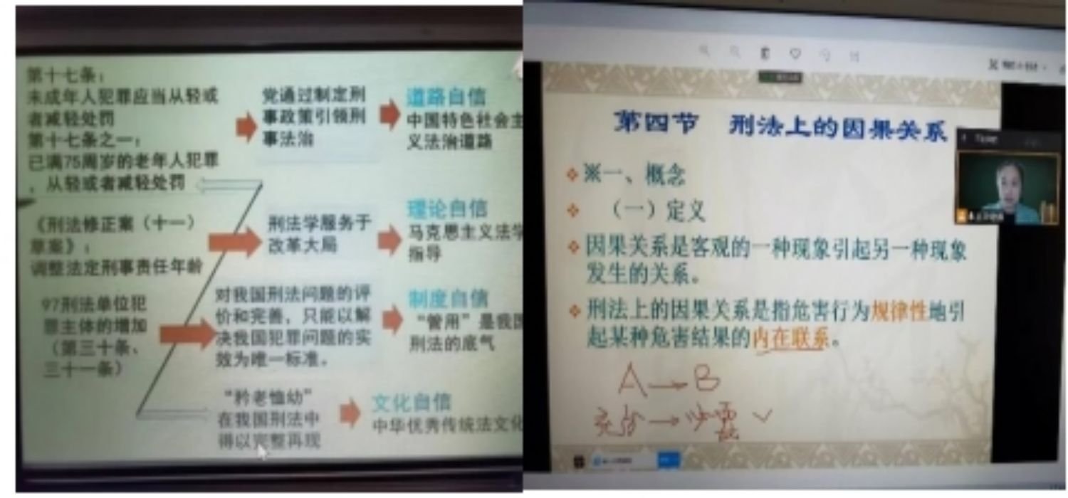 运用在线平台或课程资源,运用“直播+点播”的模式,保障课堂的连续性与即时性。①直播实时授课:身临课堂的体验。腾讯会议直播授课,与教学计划安排同步,保持线下教学节奏,实现教学“主阵地”功能,完成教学任务。师生在课堂上就相关问题及时交流、互动,方便老师及时洞察学生知识接收情况并随时调整教学进度。②PPT语音录课:利于反复收听。通过录制幻灯片的方式插入讲课语音,学生能够根据该次课内知识点的难易程度、理解程度自主控制学习进度,有更多自由时间耐心做好学习笔记,扎实学习效果。③中国大学慕课:线上教学的辅助刑法课程网络教学资源丰富,慕课资源由多个高校教师精心打造制作的在线精华课程,学生可以体会接受不同老师的讲授风格,并利用慕课中单元测验、课后作业等增强学习效果。