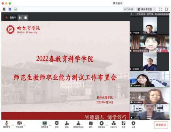 本学期师范生教育教学能力考核工作为学校首次进行。学校准确把握教育部和省教育厅相关文件精神,严格按照国家中小学教师资格考试标准和师范生教师职业能力标准,制定《哈尔滨学院师范生教育教学能力考核办法》,严密组织实施考核工作。学校成立了以校长于成学担任组长、工会主席陈威为副组长的师范生教育教学能力考核领导组,相关二级学院下设师范生教育教学能力考核小组。教务处和相关二级学院精心筹备,先后制定了《哈尔滨学院师范生教师职业能力网络远程测试考场规则》、《哈尔滨学院师范生教师职业能力网络远程测试考生诚信承诺书》、《哈尔滨学院2022年春季学期教师职业能力测试监考工作要求》等规则。教务处通过建立微信群及时了解学生动态,并积极做好师生咨询服务工作。相关二级学院主要领导高度重视,多次召开学院会议商讨和安排师范生过程性考核办法与标准、教师职业能力测试命题原则与校内外命题教师认定、线上试卷发布、线上阅卷质量保障、监考和考试纪律等,工作细致到位,确保了本学期师范生教育教学能力考核工作圆满完成。