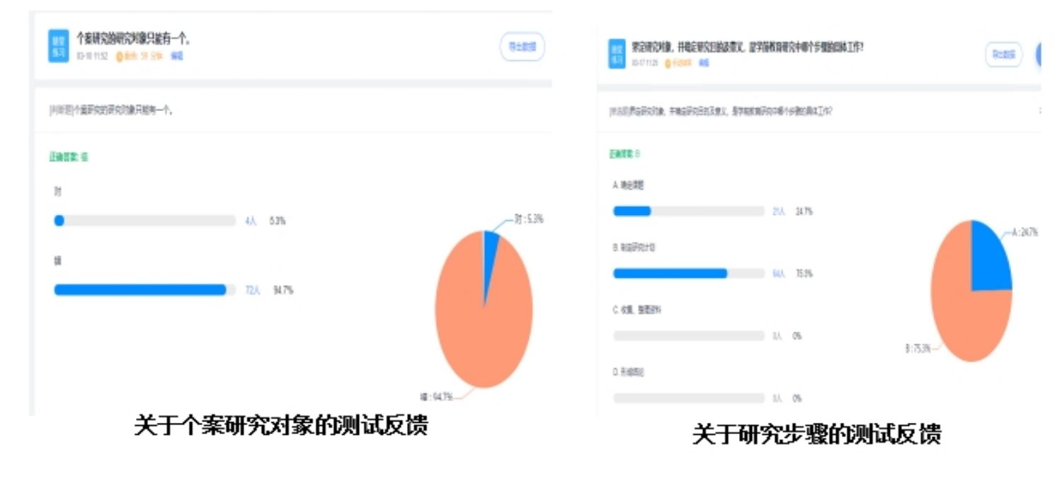 关于“个案”的问题准确率比较高,说明学生掌握情况较好。关于“研究步骤”错误率高,在后续课堂实时讨论中发现,学生会将“制定研究计划”与“撰写开题报告”割裂成两个步骤,在当堂课程及时反馈的同时,也会给第二章课堂实施时提供本届学生学习难点的提示。同时,会给学生在课后进行个人答疑。答疑过程中会发现对于学习“学前教育研究分类”的目的,学生会有理解上的偏差,因此也在下一次上课时做了及时的提示和反馈。