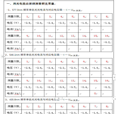 (四)实验内容及注意事项 1、在577.0nm、546.1nm、435.8nm、404.7nm四种单色光下分别测出光电管的伏安特性曲线,并根据此曲线确定遏止电位差值,计算普朗克常量。