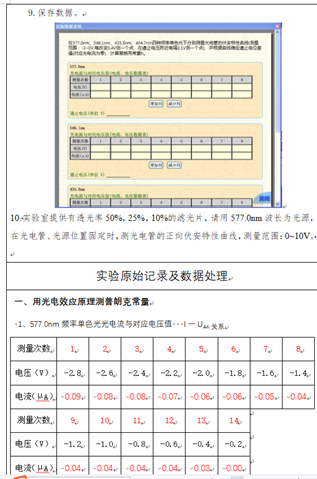仿真实验数据表格 实验报告需记录的数据参考列表 注意事项: 1、实验过程中汞灯只能开关一次 2、先完成校准再测量,一旦不小心改变了光电管与光源间的距离,需重新校准仪器。 3、正确读数,表格中需能看到截止电压 4、一旦误操作,重新开始实验,仪器校准后从断开处继续,无需整体重做。 5、测普朗克常量实验结束后,无需整理实验仪器,直接进入下一个实验 (因虚拟仿真实验记录学生操作打分所需,真实实验需整理仪器) (思政要素:培养学生事实求是的科学态度,严谨的科学作风,爱护公物的优良品质。) (五)学生实验 学生分组实验操作(数据采集及处理) 1、仪器的校准 2、在577.0nm、546.1nm、435.8nm、404.7nm四种单色光下分别测出光电管的遏止电位差值 3、作出