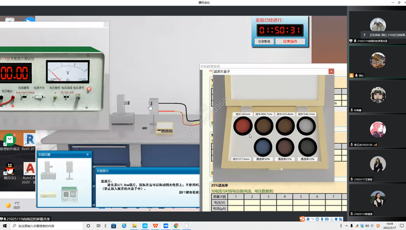 关系曲线,计算普朗克常量h。 4、用577.0nm波长为光源,在透光率100%,50% , 25% ,10%测定光电管的电压电流值 5、找出不同透光率下的饱和电流,验证饱和电流与光强关系。 学习通发放主题讨论,学生实时上传实验图片,教师检查实验数据,腾讯会议同学分享屏幕交流反馈,教师发现问题及时指导。