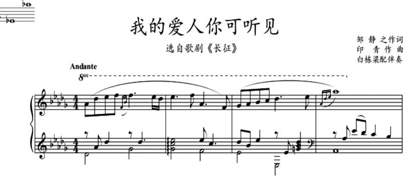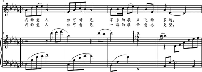 (根据学生的发言及准备资料、谱例进行归纳总结。培养学生善于思考、课前预习、熟悉谱例、上课带着问题,有目的、有重点的学习习惯。) (二)知识讲授与演唱指导 1、《我的爱人你可听见》的唱段分析 《我的爱人你可听见》是剧中彭政委的饰演者阎维文老师演唱的一个经典唱段,该唱段旋律优美、情感真挚,虽然没有用过多华丽的词藻,但却依然能够表达对爱人、对家乡最真挚的思念之情。 这首歌曲一共分为两段,歌曲第一段像是在对自己的爱人诉说着心中的话,展示出中国工农红军细腻的情感,表达对家乡与亲人的爱,正是这份爱支撑着红军战士们不畏艰险、勇于抗争,给予他们保家卫国、战胜邪恶的决心,以及敢于面对二万五千里长征途中大大小小的艰难险阻和革命终将胜利的信心。 歌曲第二段仿佛像是一面镜子,它映照出红军长征过程中革命先辈在生死存亡关头却依然能够不畏牺牲、敢于对抗反动势力的坚强意志、舍身忘死的英雄主义精神和向着美好前进奋斗的乐观精神品质。“一路的艰辛意志更坚”这一句歌词就将红军精神淋漓尽致地展现了出来,也正是这种不屈不挠的伟大精神才一步一步的成就了如今我们祖国繁荣昌盛的今天。 歌曲结尾“待到云开见日时”象征着伟大革命的胜利,亿万劳苦百姓当家做主。“笑看大地换人间”,用最灿烂的微笑迎接一个新的中国,一个没有压迫、没有侵略、没有杀戮的全新的社会。 2、歌词解析 《我的爱人你可听见》这一唱段是一首典型的具有浓厚民族特色的歌曲,一共分为两个乐段。 第一乐段: 我的爱人你可听见,家乡的歌声飞得多远 日夜思念苦,风霜不觉寒,总感到你就在我身边 大雁南飞,带走我的情,你的爱伴我路漫漫 待到云开见日时,笑看大地换人间 歌词语气平和,满怀爱意的双眼像是在对着自己的爱人诉说着什么,体现了一种“隔空对话”的独特情景,“日夜思念苦,风霜不觉寒”,对爱人、对亲人日日夜夜的思念,让红军战士们忘记了困难,忘记了艰辛,忘记了寒冷。面对艰难险阻,总有一份爱在支撑着红军战士们勇往直前,无畏艰难,“大雁南飞”象征着一种爱的寄托,将对家人思念的这份爱寄托给这南飞的大雁,“待到云开见日时”,具有象征意义,“云”代表着伟大革命道路上的一切风险与挑战,“日”象征着光明,象征着胜利。这句话表明了几十万红军战士和亿万万劳苦百姓的共同心愿,伟大革命取得最终的胜利。最后“笑看大地换人间”,象征着革命胜利,建立中华人民共和国,劳苦百姓最终翻身做了国家的主人。同时又展现出作者创作的浪漫主义的文学色彩和艺术效果。 第二乐段: 我的爱人你可看见,一路的艰辛意志更坚 万水千山险,壮怀热血燃,我们的理想永不改变 大雁南飞,带走我的情,你的爱伴我路漫漫 待到云开见日时,笑看大地换人间 像是某种再现,再现了万里长征一路上的艰难险阻,又以一种微妙的方式表明了为夺得革命胜利的红军战士们那一份初心不改,至死不渝的英雄使命。 3、情感表达 《我的爱人你可听见》是一首旋律婉转悠扬,优美流畅的歌曲,歌词简单,却将战士们对家乡和亲人的爱与思念之情表达得淋漓尽致,同时又体现出红军战士们不畏牺牲、百折不挠、永不退缩的勇气和无所畏惧的斗争精神,还体现了红军战士们对夺取战争胜利的坚定信心和迫切向往。在演唱第一乐段时,语气要略微平和一些,眼中饱含着爱意与思念,向爱人诉说着心中的话,“日夜思念苦,风霜不觉寒”,只要心里有着这份思念,哪怕身在异乡,哪怕饱经风霜,也不会觉得苦和累。 在演唱第二乐段时要表达出比第一遍更加深刻的情感,情绪要更加激昂一些,眼神要更加坚定一些,与第一月端形成一定程度上的对比,“万水千山险,壮怀热血燃”,红军战士将热血和青春无偿地投入到保卫人民的战斗中,不畏牺牲,勇于抗争的红军精神时刻流淌在红军战士的血液中。 讨论: (1)歌曲的两个唱段在演唱处理上有何不同之处? (2)你是如何塑造人物形象的? 4、艺术特征分析 《我的爱人你可听见》是一首降D宫系统的不带再现的单二部曲式,节拍为4/4拍。 全曲速度为行板,演唱时速度应该控制在中速,旋律优美动听,极富歌唱性。 全曲包括前奏(1~4小节)、第一乐段(5~12小节)、第二乐段(13~20小节)。 前奏:由4个小节构成,又可分为2+2的周期性结构组合,为综合性引子,主题材料的先现,旋律优美动听,引人入胜,调性为降A徵(加清角)。引子最后旋律逐渐上行,为主题材料的出现做情绪上的准备。